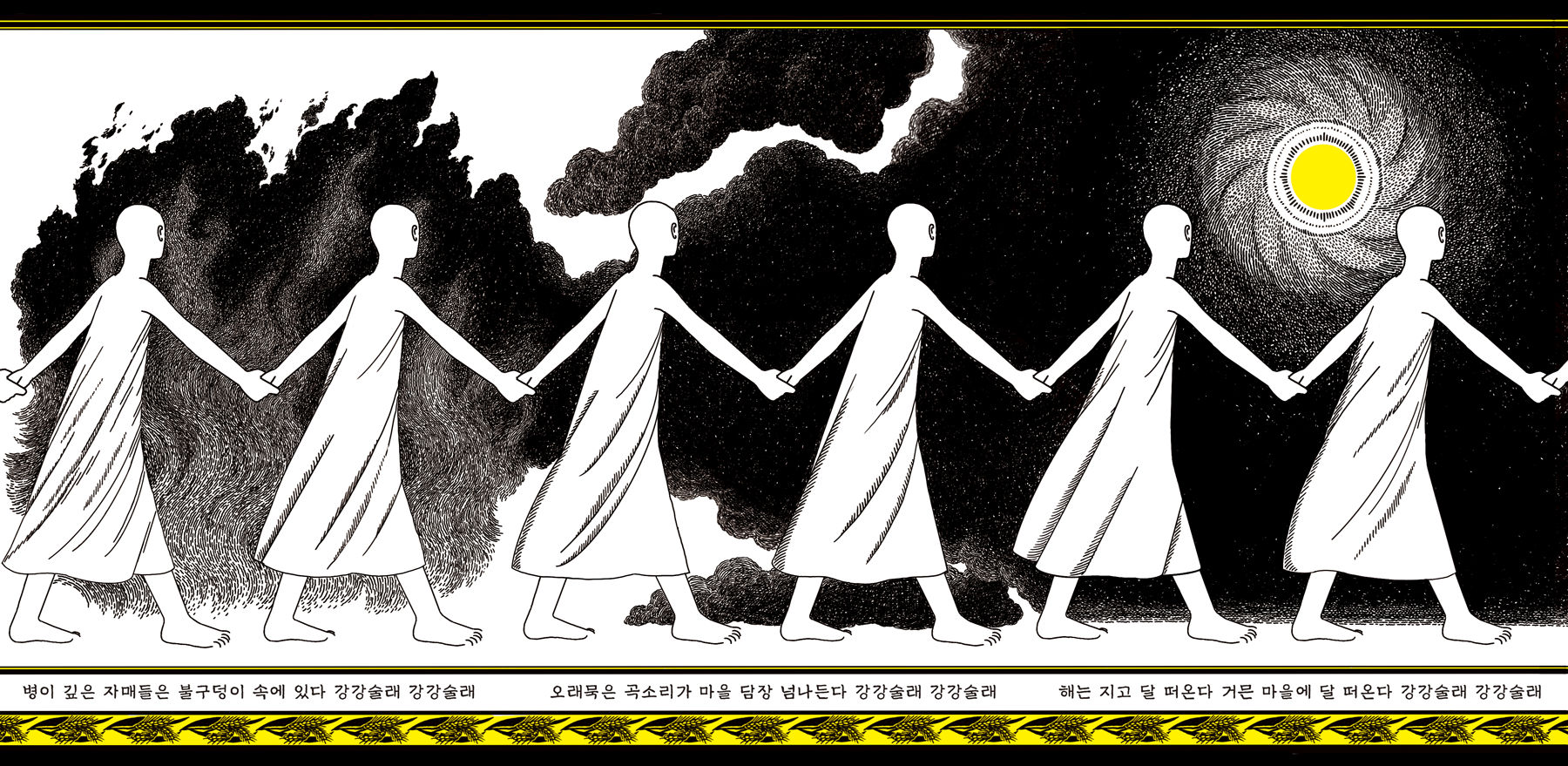 반복적으로 등장하는 인물들을 모티브로, 강강술래 노래 가사를 담은 아코디언 북입니다.